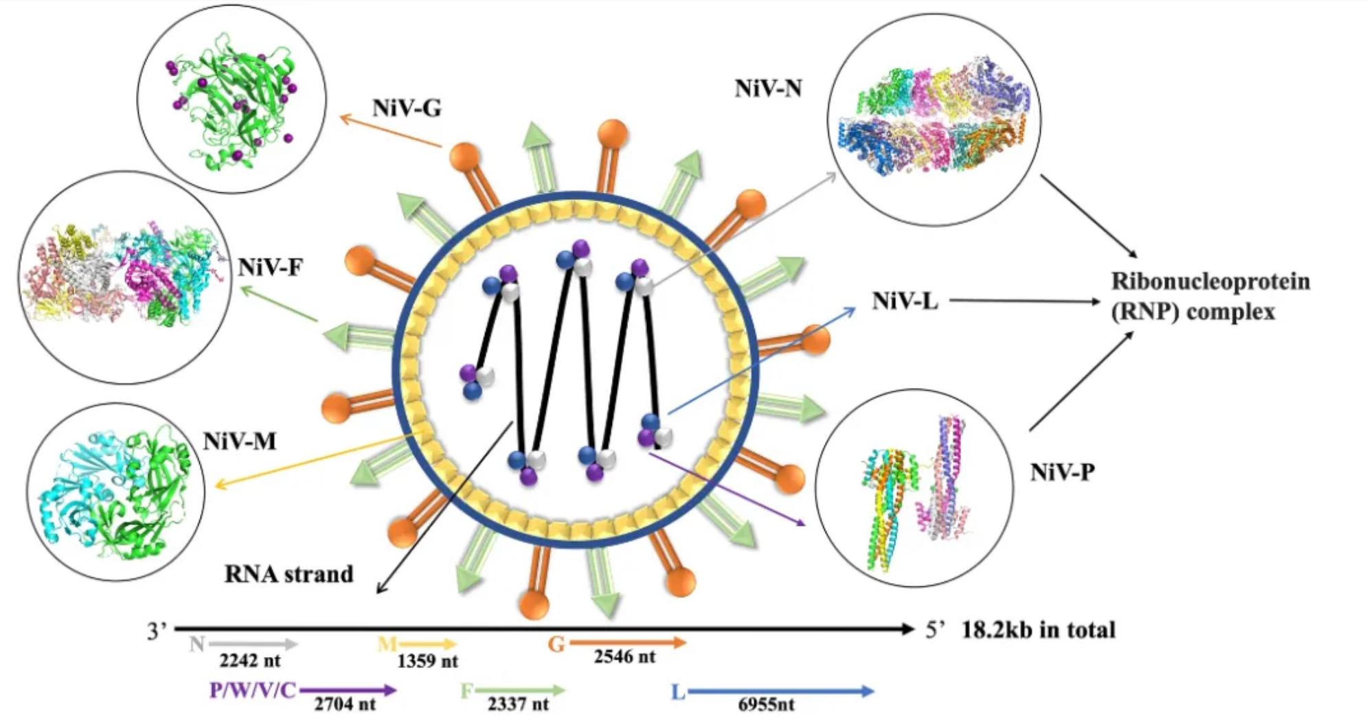 图1 尼帕病毒(NiV)六种靶蛋白的结构及其核苷酸长度[1]