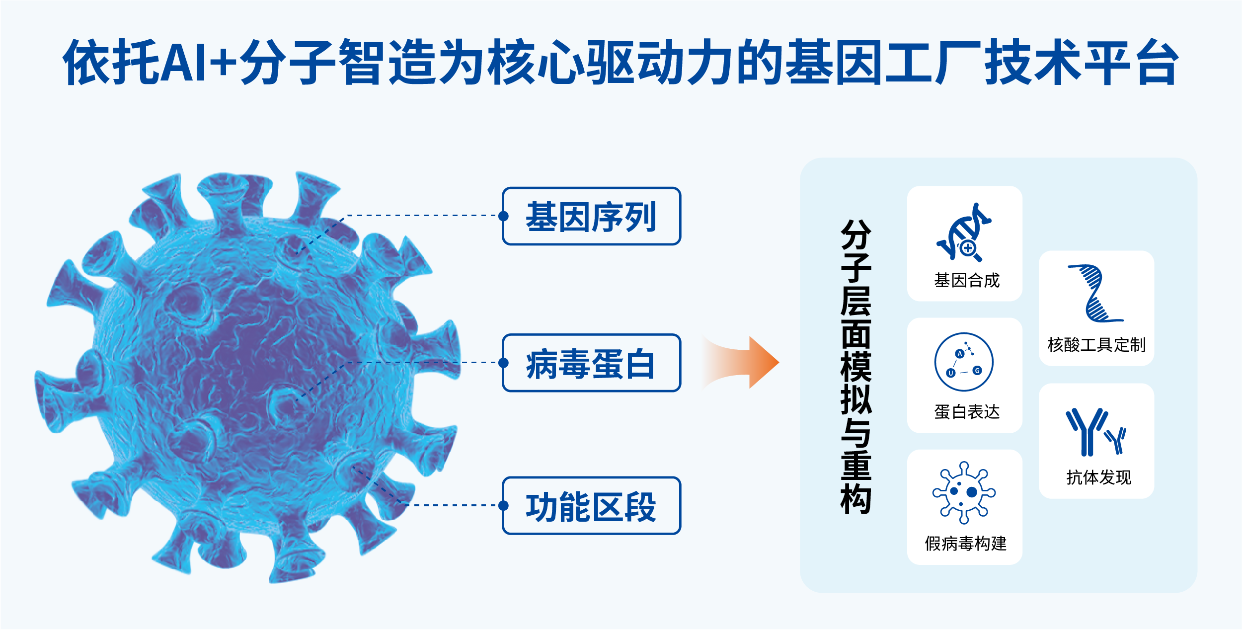 依托以 AI+分子智造为核心驱动力的基因工厂技术平台,我们将高风险病毒相关研究需求,转化为可在不涉及高等级生物安全设施、并适配常规分子生物学实验条件的实验环境中开展的分子级解决方案,覆盖基因合成、核酸工具定制、蛋白表达、假病毒构建、抗体发现全环节,全程无真实病毒接触,精准适配高校科研团队、体外诊断试剂公司、抗体药物研发公司、疫苗研发公司等不同研发主体的需求,帮助科研与产业团队把研发窗口前移。